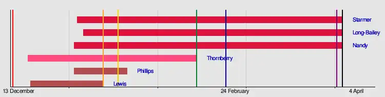 The deadline for PLP and EPLP nominations was 2.30 pm on 13 January.[60] Lewis, with only five nominations including himself, withdrew from the contest shortly before the deadline.[61] Thornberry was also short of the required nominations at the beginning of the day, but managed to obtain enough to qualify less than ten minutes before the deadline, helped by MPs who had formerly nominated Lewis.[62] After the close of nominations, the party announced that Long-Bailey, Nandy, Phillips, Starmer and Thornberry would proceed to the next stage of the election.[63] Starmer received 88 nominations, more than any other candidate, followed by Long-Bailey with 33 and Nandy with 31.[64] Phillips and Thornberry were each nominated by 23 MPs and MEPs, one more than the minimum requirement of 22. Shortly after these nominations were published, Starmer was heavily favoured in the betting odds.[62]