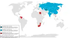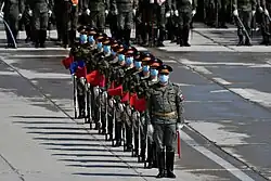 In addition to troops from the Russian Armed Forces, contingents from 20 foreign countries were also planned be on parade, groups from the Commonwealth of Independent States (CIS),[7][8] as well as contingents from China, India, Serbia, France, the United Kingdom, United States, Poland and Mongolia, returning after a 5 to 10-year hiatus. Parade groups from Belarus, Egypt, Israel, and Iran were planned to be invited.[9] Many of these plans however were scratched in light of the COVID-19 pandemic. The original contingent from Kyrgyzstan was supposed to be provided by the Honour Guard of the National Guard of Kyrgyzstan. However, this was scrapped after it became known that one of its members had become infected with the coronavirus.[10] A contingent from the General Staff represented the country in their place.[11] Days before the parade, it was reported that multiple members of the Belarusian contingent had become ill with the coronavirus.[12]