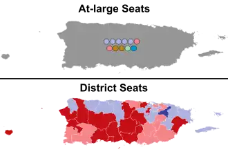 The New Progressive Party lost their 2/3 majority. The Popular Democratic Party narrowly surpassed the 26-seat threshold, and acquired the 1/2 majority. The Puerto Rican Independence Party retained their seat, while the Citizen's Victory Movement and Project Dignity gained two and one seat, respectively.