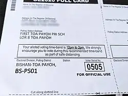 Voters were given a recommended two-hour time slot to cast their vote on Polling Day (from 8 am to 8 pm) on their ballot card as a measure to counter long queues during polling. Measures for safe distancing still apply on polling day. Voters with fever or respiratory symptoms would be denied entry from the polling stations, except during the last hour (7 pm to 8 pm).[62][57] Voters who are unable to vote because of medical issues, or because they are overseas, will be delisted from the registrar of voters due to mandatory voting, but will not need to pay the $50 fee for reinstating their names. Voters had to use hand sanitizer before voting, and were initially required to wear disposible gloves, but this was later changed due to the requirement causing long queues.[63][64] Elderly voters above the age of 65 were given a special time slot in the morning. The restrictions caused long queues at polling stations.[65]