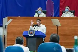 In his speech which lasted for 1 hour and 41 minutes,[11] Duterte addressed the current pandemic and its effects to the country. He urged Congress to pass 21 priority bills[12] among which includes the passage of COVID-19-related bills such as the "Bayanihan to Recover as One Act", "Corporate Recovery and Tax Incentives for Enterprises (Create) Act" and "Financial Institutions Strategic Transfer (Fist) Act"; the lifting of continuing professional development (CPD) units requirement on professionals and the re-imposition of death penalty in the country. Also among the proposed measures were the creation of new government agencies such as a Department of Overseas Filipinos to focus on Filipino migrant workers, a Department of Disaster Resilience to spearhead in disaster response, a National Disease Prevention and Management Authority which will equip the country from future disease outbreaks and a Boracay Island Development Authority that will oversee the post-rehabilitation aspect of Boracay Island.[13]