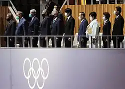 International Olympic Committee President Thomas Bach and Crown Prince Fumihito entered the stadium while a theme from the film Tokyo Story played.[45][46] (JST 20:01)