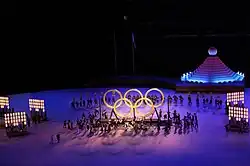 The unveiling of the Olympic Rings, which were made from trees planted in the Olympic Village during the 1964 Summer Olympics. It starred tap-dancing performers wearing hanten coats, which were traditionally worn by Edo-era craftspeople and carpenters and evoked Japanese summertime festivals, at which this style of clothing is common,[68][63] as they built what has either been described as a mock Olympic Village[67] or a matsuri, as the rings were brought while being surrounded by Japanese paper lanterns.[69]