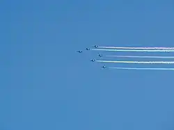 On the day of the ceremony, there was an exhibition flight by Blue Impulse, the aerobatics squadron of the Japanese Air Self Defense Force. The squadron drew the Olympic Rings over the Tokyo skies, marked the 57th anniversary of the 1964 Games for the first time in Tokyo.[59][60]