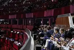 By late 2020 and early 2021, organizers were also debating the issue of audience attendance. While early discussions considered reduced capacity, by July 2021 it was determined that no live audience would be permitted due to public health concerns. The final compromise allowed only competing athletes (if they chose to attend), a maximum of six officials from each delegation, and a limited number of invited VIP guests.[31][5] Much of the artistic and cultural programming was modified to comply with social distancing requirements, with many segments being pre-recorded rather than performed live.[6] These measures reinforced the unprecedented and subdued atmosphere surrounding the Games.
