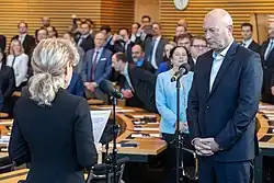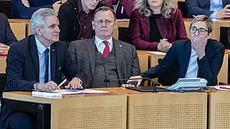 Kemmerich accepted the election without hesitation and was sworn in.[23] Later, Christian Lindner justified this by saying that Kemmerich had been "overwhelmed" by the situation.[27] After Reinhold Maier, he was thus the second elected FDP Minister President of a state in the history of the Federal Republic of Germany, but at the same time the first Minister President ever to come from the ranks of the smallest parliamentary group in the Landtag and to rely on votes from the AfD for his election.[28][29] In terms of electoral law, the election of the Minister President was formally flawless; however, there was a consensus between the Union parties and the FDP on the one hand and the Left, SPD and Greens on the other hand, both in Thuringia and throughout Germany, not to enter into a coalition with the AfD, led in Thuringia by Björn Höcke, a politician considered by most to be on the extreme right-wing.
