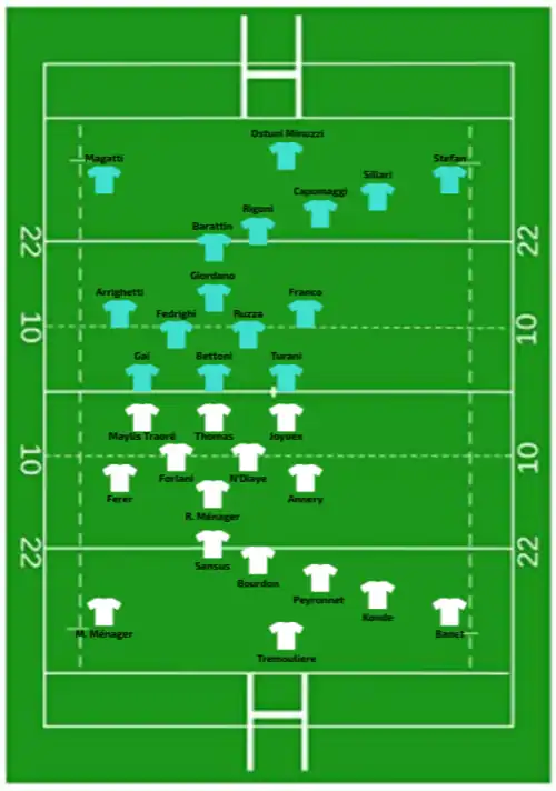 | 21:00 CET (UTC+01:00) | Try: Forlani 5' c Banet (2) 17' c, 32' c Annery 44' c Penalty try 78' Sansus 80' +1 c Con: Trémoulière (4/4) 6', 18', 33', 45' Bourdon (1/1) 80' +2 Pen: Trémoulière (1/1) 12' |