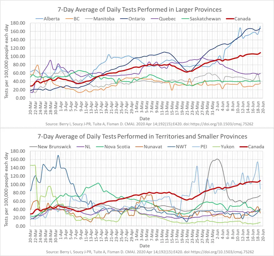 - ^ Berry, Isha; Soucy, Jean-Paul R.; Tuite, Ashleigh; Fisman, David (April 14, 2020). "Open access epidemiologic data and an interactive dashboard to monitor the COVID-19 outbreak in Canada". CMAJ. 192 (15): E420. doi:10.1503/cmaj.75262. ISSN 0820-3946. PMC 7162433. PMID 32392510.