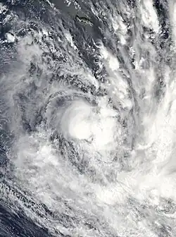 On 6 December, the BoM predicted that a tropical low could form near the Solomon Sea.[36] Two days later, the tropical low formed, resulting in the BoM designating it as 07U,[37][3] while the JTWC issued a TCFA on the system.[38] The system's deep convection became more organized overnight on 10 December, and began to strengthen, with gale-force winds being reported on 11 December.[3] Late on the same day, the JTWC upgraded the system into a tropical storm.[39] By the next day, it was upgraded to a Category 1 tropical cyclone on the Australian scale, resulting in the BoM naming it Ruby. Twelve hours later, the BoM would upgrade Ruby into a Category 2 cyclone,[3] while the JTWC upgraded the system into a category 1-equivalent tropical cyclone.[40] By 13 December, Ruby reached its peak intensity,[3] before entering the South Pacific basin.[41]