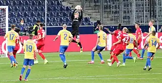 ![]() Brøndby playing against Red Bull Salzburg in the 2021–22 UEFA Champions League play-off round | |