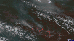 ![]() Satellite imagery showing wildfires in British Columbia producing pyrocumulonimbus clouds spawning lightning strikes. | |