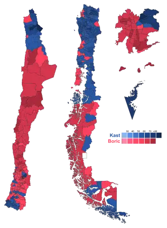 Despite narrowly trailing conservative candidate José Antonio Kast in the first round of the presidential election, leftist candidate Gabriel Boric emerged as the winner of the second round with 56% of the vote, a larger margin than predicted by opinion polls.[2] Kast conceded defeat shortly after voting ended.[3][4] At the age of 35, Boric became the youngest president ever elected in Chile and also set a record for receiving the highest number of votes in Chilean history. The turnout in the second round increased to 56%, the highest since voting became voluntary in Chile in 2013.