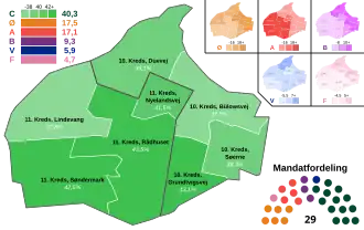 | 11. Kreds, Søndermark | 19.1 | 7.8 | 42.5 | 0.9 | 0.1 | 3.8 | 0.3 | 0.2 | 1.0 | 0.7 | 0.2 | 1.1 | 0.1 | 0.1 | 5.2 | 0.2 | 15.9 | 0.7 |