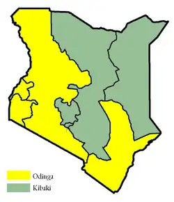 Kenyatta and Odinga's Azimio la Umoja coalition remains committed to the BBI as a centerpiece of their platform.[87] After the High Court ruling in May, former Prime Minister Odinga voiced his continued belief in the reform package.[48] As Kenya's politics are still split along ethnic lines, with the victors controlling the "spoils of power," the Azimio coalition supporting Odinga is filled with political veterans with large ethnic bases of support.[38] Kenyatta's support brings a sizeable constituency of Kikuyu voters, one of Kenya's dominant ethnic groups.[88] The addition of Kalonzo Musyoka's Wiper Party brings the Kamba group on board.[89] The coalition contains over 20 parties, including the Kenya African National Union, led by Gideon Moi.[90] KANU previously held power in Kenya from 1961 until 2002, first under Uhuru Kenyatta's father, President Jomo Kenyatta, and then under President Daniel arap Moi, father of Gideon.