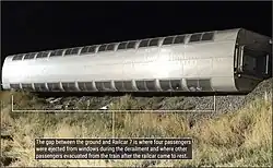 The rear four cars (a Sightseer Lounge, two coaches and a sleeper), all destined for Portland, tipped over after derailing.[8][10] Three people on board were killed, and 49 others were injured,[2] including 15 who were hospitalized.[7][11]