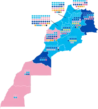 The elections were won by the National Rally of Independents (RNI), led by Aziz Akhannouch, which won 102 seats, gaining 65. It was followed by the Authenticity and Modernity Party (PAM), which won 87 seats, losing 15. In third place, the Istiqlal Party won 81, gaining 35 seats. The Socialist Union of Popular Forces (USFP) won 34; the Popular Movement (MP), 28; the Party of Progress and Socialism (PPS), 22; the Constitutional Union (UC), 18; the Democratic and Social Movement (MDS), 5; the Front of Democratic Forces (FFD), 3 and the Alliance of the Left Federation (FGD), 1. The historic defeat of the Justice and Development Party (PJD) led the ruling party to win only 13 seats, thus losing 112, more than 90% of its seats and placing it in eighth place after winning the three previous elections. Saadeddine Othmani also failed to win re-election in his constituency of Rabat.[36] Two new parties entered: FFD with 3 deputies and PSU with one. The PUD and the PSGV lost one seat each, thus remaining outside the House of Representatives.[37][38][39]