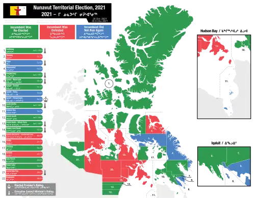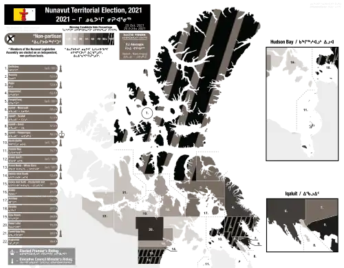 The 2021 Nunavut general election was held on October 25, 2021, to return the members of the 6th Nunavut Legislature. Since the adoption of a fixed election date law in 2014,[2] general elections in Nunavut are held in the last Monday of October in the fourth calendar year following the last elections.[3] The Legislative Assembly of Nunavut can be dissolved earlier by the Commissioner of Nunavut on the advice of the Premier of Nunavut.