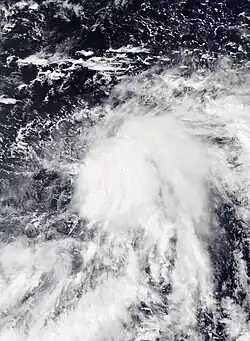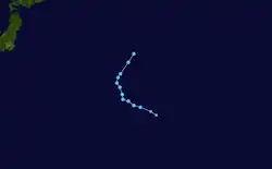 At 00:00 UTC on June 18, the JTWC started to monitor a broad area of convection nearly 250 km (160 mi) to the south-southwest of Pohnpei.[92] The system remained weak as it moved northwestwards in a favorable environment for further intensification, characterized by warm sea surface temperatures, low to moderate wind shear and good outflow; the disturbance remained weak as it moved northwestwards.[92][93] The JTWC issued a TCFA on the system two days later, though the system remained disorganized.[94][95] The JMA upgraded the system to a tropical depression at 00:00 UTC on June 21.[96] Meanwhile, the JTWC designated it as 06W in their first advisory on the system, with an exposed LLCC being evident on satellite imagery due to moderate wind shear, being induced by a tropical upper tropospheric trough to its north.[97][98] By 21:00 on June 21, 06W made its closest passage to the south-southwest of Guam, continuing its northwest track.[99][100] On June 22, at 06:00 UTC, the JTWC upgraded the system into a tropical storm as it continued to move away from Guam.[101] The JMA followed and upgraded the system into a tropical storm, in June 23 at 00:00 UTC, and assigned it the name Champi.[102] At 18:00 UTC, the JMA upgraded the storm to a severe tropical storm as it turned northwestwards.[103] At this time, a microwave imagery scan of Champi revealed an eye feature emerging in the system; however, this was short lived as dry air continued to impact the storm from the west.[104] In addition, poleward outflow on the system remained weak on June 24, restricting Champi to significantly develop.[105] However, on the next day, as a shortwave trough crossed the Ryukyu Islands, the outflow increased on the storm which allowed it to intensify further.[106] On June 25, at 06:00 UTC, the JMA officially declared the storm a typhoon.[107] The JTWC soon followed, upgrading it into a Category 1-equivalent typhoon.[108] At this time, a Champi turned north and north-northwestwards, and subsequently reached its peak intensity of 120 km/h (75 mph) ten-minute maximum sustained winds with a minimum barometric pressure of 980 hPa (28.94 inHg) by 21:00 UTC on June 25, however it was downgraded to a tropical storm a day later.[109] The storm continued to weaken as it move towards the Japanese islands, until on June 27, the JMA issued its last advisory at 12:00 UTC as the system became an extratropical low.[110] The JTWC also issued its last warning for Champi at 09:00 UTC, same day.[111]