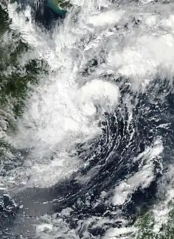 On May 11, the JTWC noted a persistent area of convection in the Philippine Sea, approximately 184 nmi (341 km) west of Palau.[41] The JTWC issued a TCFA for the convection on May 12, as it further developed in an environment with low vertical wind shear and warm sea surface temperatures.[42] Just three hours later, the agency recognized that the area of convection had quickly consolidated into a tropical depression and assigned it with the identifier of 03W.[43] Around the same time, the JMA had also recognized the storm as a tropical depression while it was to the east of Mindanao.[44] Since the storm developed within the Philippine Area of Responsibility, the PAGASA immediately named the storm Crising once the agency recognized it as a tropical depression as well, and later raised Signal No. 2 warnings for areas in Mindanao.[45][46] In the early hours of May 13, the JTWC upgraded the system into a tropical storm, with the PAGASA following suit hours later.[47][48] Later that day, Crising's low-level circulation center became exposed due to wind shear, and it lost organization. At 8:20 p.m. Philippine Standard Time (12:20 UTC), Crising made landfall in Baganga, Davao Oriental as a weakening tropical storm. It quickly degraded as soon as it made landfall, with both the JTWC and the PAGASA downgrading it to a tropical depression at 15:00 UTC.[49][50] At 03:00 UTC on that day, the PAGASA reported that the system degenerated to an area of low-pressure in the vicinity of Piagapo in Lanao del Sur, thus lifting all warning signals on Mindanao and issuing their final advisory.[51] On May 14, the system dissipated over the Sulu Sea, and both the JMA and the JTWC issued their final advisories on the storm.