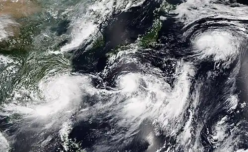By the end of July, activity abruptly increased as eight tropical depressions formed within a week. Half of them were short-lived and dissipated without becoming tropical storms. Another depression and the remaining three were named Lupit, Nida, and Mirinae. Lupit and Mirinae both threatened Japan while Nida stayed out to sea. A system from the Central Pacific traveled a long distance and became Tropical Storm Omais over the Philippine Sea.