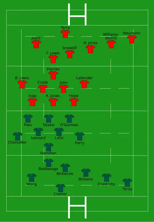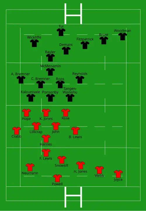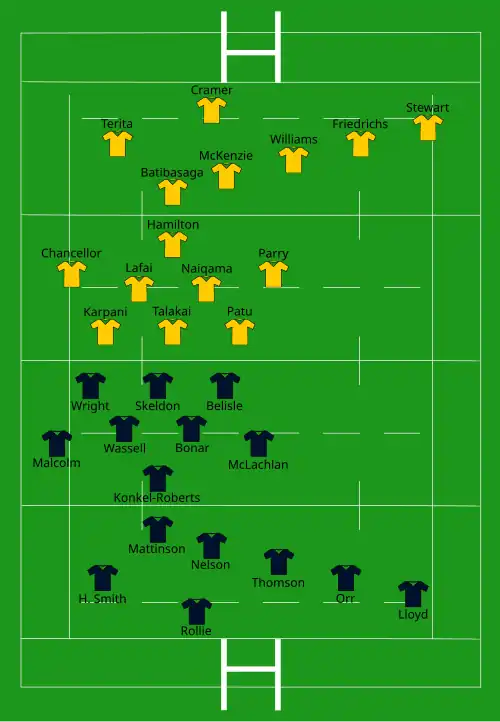 | Try: F. Lewis 40+1' c Harries 78' m Con: Snowsill (1/1) 40+2' | Report | Try: C. Bremner 17' m Woodman (2) 20' m, 28' c Brunt (2) 25' m, 49' m Roos 41' c Fitzpatrick 44' m Murray 57' c Demant 72' m Tui 80+1' m Con: Demant (3/8) 29', 42', 58' |