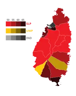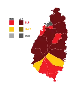 The SLP flipped seven seats, winning 13 of the 17 in the House. For the first time since independence, the UWP lost the Micoud North seat. The UWP retained only two seats, those of PM Chastenet and Commerce Minister Bradley Felix, while the two former UWP members running as independents, Stephenson King and Richard Frederick, won their seats.[17][18][19]