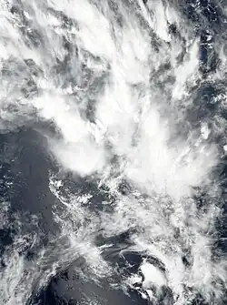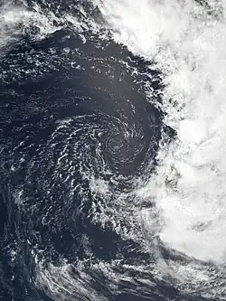 On 5 January, the FMS began monitoring a tropical disturbance near Fiji, designating the system as 03F.[21] Later that day, the Joint Typhoon Warning Center (JTWC) began monitoring 03F, though its development was inhibited due to wind shear.[22] The system's chances of developing increased,[23] and on 8 January, the JTWC issued a Tropical Cyclone Formation Alert for 03F.[24] On the same day at 21:00 UTC, the JTWC upgraded 03F to a tropical depression, assigning it the designation 05P.[25] 03F briefly weakened on the next day; however, it reorganized, with a satellite scatterometer pass showing winds of 35 knots (65 km/h; 40 mph) prompting the JTWC to upgrade it to a tropical storm.[26] On 10 January, the FMS upgraded 03F to a Category 1 cyclone on the Australian scale and assigned it the name Cody. The FMS estimated peak 10-minute sustained winds of 130 km/h (80 mph), with the JTWC estimating peak 1-minute sustained winds of 95 km/h (60 mph). The JTWC assessed that Cody transitioned into a subtropical cyclone on 11 January,[27] with the FMS issuing its last advisory for Cody late on 12 January.[28]