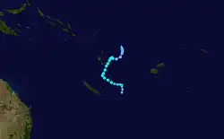 On February 4, the United States Joint Typhoon Warning Center reported that a tropical disturbance had developed within the Australian region about 1,285 km (800 mi) to the west of New Caledonia.[31] The disturbance was starting to develop a low-level circulation, which was accompanied by fragmented atmospheric convection, along a frontal boundary that extended across the Cape York Peninsula and the Coral Sea.[31] Over the next couple of days, the Australian Bureau of Meteorology (BoM) and the Fiji Meteorological Service (FMS) started to monitor the poorly organized system as Tropical Low 18U and Tropical Disturbance 08F, as it moved eastwards within the frontal boundary towards Vanuatu and the South Pacific basin.[32][33][34] During February 7, the system started to slowly consolidate, as it passed to the north of New Caledonia, before the FMS classified the system as a tropical depression.[35][36] At this stage, the depression was moving eastwards and was predicted to continue to move eastwards towards Fiji, however, the depression slowed down as it approached the islands of southern Vanuatu during February 8.