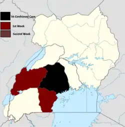 On 12 October, the first confirmed case and death in the capital of Kampala occurred, although he was believed to have fled from an already infected district.[10][30]