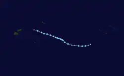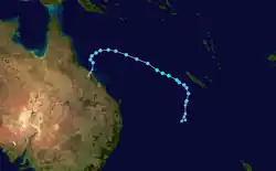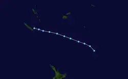 On February 22, the FMS reported that a low-pressure system was located just south of Samoa, and gave it a low chance of formation into a tropical cyclone in the next 5 days.[76] Under a moderate sheared environment and warm sea surface temperatures, the system organized into a tropical disturbance late on the next day, with the FMS designating it as 08F.[77] The disturbance steered southwest from a subtropical ridge on February 26 after upgrading to a tropical depression.[78] During February 26, the JTWC issued a Tropical Cyclone Formation Alert (TCFA) on the system.[79] The system was upgraded to a Category 1 tropical cyclone and attained the name Judy from the FMS after improved organization the same day.[80] The JTWC also upgraded the system to Tropical Cyclone on February 27, initiating advisories on it as Tropical Cyclone 15P.[81] Judy further developed due to high sea surface temperatures of 30 °C (86 °F), leading to the FMS to upgrade its status to Category 2 tropical cyclone the same day,[82] before upgrading further to a Category 3 severe tropical cyclone on February 28.[83] Judy eventually became a Category 4 on the Australian scale and Category 3 on the SSHWS.[84][85] The system began to weaken as it headed southeastward, entering the area of responsibility of the MetService.[86] The JTWC issued their last warning on the system on March 3 as it transitioned to a subtropical cyclone.[87] At the same time, the MetService had downgraded the system to Category 2 tropical cyclone status.[88] It later became an extratropical cyclone by the next day.[89]
