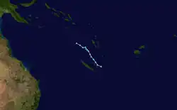 Late on January 5, the FMS reported that Tropical Disturbance 03F had formed near New Caledonia.[19] The system generally moved southeast before the FMS ceased advisories on the system, on January 7.[20] However, on January 8, the JTWC gave the system's chance for development, although in favorable environment, as low since it was in close proximity with Hale.[21] But upon reanalysis, convection re-fired, and an eye feature was visible,[21] although the JTWC later reported that the system had dissipated the following day.[22]