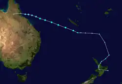 Tropical Low 18U entered the basin on March 1 where it became designated as Tropical Depression 09F by the FMS.[90] The JTWC classified it as a Tropical Storm, initiating advisories as Tropical Cyclone 16P.[91] The system was assigned the name Kevin by the FMS as it strengthened into a Category 1 tropical cyclone on the Australian scale.[92] It later intensified to a Category 2 as it headed southeastward.[93] On March 3, it became a Category 3 severe tropical cyclone on the Australian scale and a Category 1-equivalent tropical cyclone on the SSHWS.[94][95] It rapidly intensified to a Category 5 tropical cyclone on both the Australian scale and the SSHWS on March 4.[96][97] It began to steadily weaken as it headed southeastward, entering the area of responsibility of the MetService.[98] It eventually became extratropical on March 6.[99]