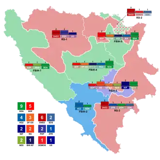 Despite Denis Bećirović, who was a candidate of the Social Democratic Party (SDP BiH), beating the Party of Democratic Action (SDA) president Bakir Izetbegović for the Bosniak spot in the Presidency, the SDA repeated its result from the previous general election in 2018, emerging as the largest party in the House of Representatives, winning 9 of the 42 seats. The Alliance of Independent Social Democrats (SNSD) came in second with 6 seats, repeating its result from the previous election as well. The SDP BiH and the Croatian Democratic Union (HDZ BiH) came in third and fourth, winning 5 and 4 seats respectively. The Serb Democratic Party (SDS) won two seats, its lowest number ever, prompting SDS president Mirko Šarović to resign the following month.[4]