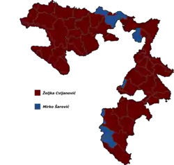 There was controversy over the election of the Croat member, as the non-nationalist candidate Željko Komšić won against the nationalist Dragan Čović (HDZ BiH) with the help of Bosniak voters, with Komšić winning first place almost exclusively in municipalities without a Croat relative majority. The result prompted protests of Croats accusing Bosniaks of out-voting and calling for the creation of their own entity or electoral constituency. In the following days, protests were held in the city of Mostar with signs "Not my president".[7][8] In the days following the election, several municipalities with Croat majority declared Komšić persona non grata.[9][10]