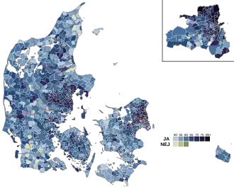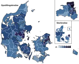 Exit polls released by national broadcasters DR and TV 2 immediately after polls closed at 20:00 CEST (18:00 UTC) indicated that a large majority of the electorate had voted "Yes".[30][31] This was the first time that Denmark had ever abolished one of its EU opt-outs.[32] It was also the highest share of the vote ever received by the "Yes" side in an EU-referendum, with the result being described by some as a landslide.[31] The turnout, at 65.8%, was among the lowest for any EU referendum in Denmark, with only the 2014 Danish Unified Patent Court membership referendum having had a lower turnout.[33] Election scholars expressed concern and attributed the low turnout to some political parties being hesitant to campaign actively, as well as opinion polls that consistently showed a strong lead for the "Yes" side.