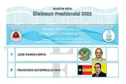 Presidential elections were held in Timor-Leste on 19 March 2022.[1] Incumbent Francisco Guterres sought election to a second term.[2] As none of the presidential nominees received at least 50% of the cast votes, a runoff was held on 19 April 2022, between the top two candidates, José Ramos-Horta and Guterres.[3] Ramos-Horta won the runoff with 62.1% of the total votes cast.[4]