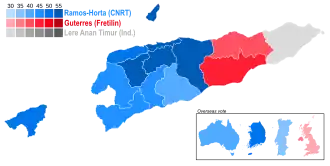 Nobel laureate and former president José Ramos-Horta won in a landslide victory over incumbent president Francisco Guterres in the second round. Speaking to supporters in a rally, Ramos-Horta proclaimed: "I have received this mandate from our people, from the nation in an overwhelming demonstration of our people's commitment to democracy."[24] He added he had not spoken to Guterres personally after the win but had received an invitation from Guterres' office to discuss a handover of power following the election.[17][24]