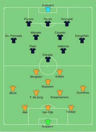 In the sixth minute of the match, Cody Gakpo cut inside and shot into the left corner of the net from just outside the penalty area to put the Netherlands in front. Just before the first half ended, Ecuadorian defender Pervis Estupiñán deflected his teammate's shot in, but the goal was called offside. Four minutes into the second half, Enner Valencia scored his third goal of the tournament to equalize for Ecuador, converting the rebound after goalkeeper Andries Noppert had saved a shot from Estupiñán. Despite Ecuador later hitting the crossbar, the game saw no further goals and ended in a 1–1 draw.[18]