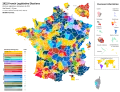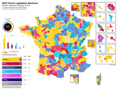 The first round was marked by a record low turnout at 47.5%.[7] Additionally, there was some controversy in the results between the Ministry of the Interior and French news outlets, such as France Info and Le Monde, in particular on whether NUPES or Ensemble finished first;[57] This was due to disagreements on whether left-wing candidates should be considered within the NUPES framework or not;[1] similar discrepancies also existed for UDC and other alliances.[58] NUPES finished either second (per the Ministry of the Interior) or first (per Le Monde), slightly behind or ahead of Ensemble (25.75–25.66% per the Ministry of the Interior and 26.1–25.9% per Le Monde).[59][60][61]