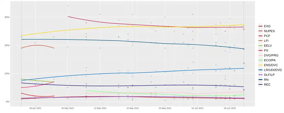 The legislative elections were contested between four principal blocs: the centrist presidential majority Ensemble coalition, including Emmanuel Macron's Renaissance, the Democratic Movement, Horizons, as well as their allies; the left-wing New Ecological and Social People's Union (NUPES), encompassing La France Insoumise, the Socialist Party, Ecologist Pole and the French Communist Party; the centre-right Union of the Right and Centre (UDC), including The Republicans, the Union of Democrats and Independents, as well as their allies; and the far-right National Rally (RN). The NUPES alliance was formed in the two months following the presidential election, in which the left-wing vote had been fragmented; it consisted of the first French Left alliance since the Plural Left in 1997.[5]