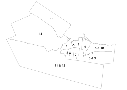 On 28 February 2022, HWDSB trustees were provided a report by school board staff outlining issues with the board's current ward parings. Provincial legislation affords the HWDSB 11 trustees, requiring the board to combine some municipal wards to create a single trustee ward. For the 2018-2022 term, Wards 1 & 2 (West Lower City), Wards 9 & 10 (Stoney Creek), Wards 8 & 14 (West Mountain), and Wards 11 & 12 (Ancaster-Glanbrook) were combined. Population growth in Wards 1 & 2 necessitates the wards being offered their own trustees, requiring new ward parings. The trustees rejected a request by staff to select a new pairing, opting instead to offer members of the public a chance to comment on new proposed pairings.[30] On 28 March 2022, trustees approved new ward parings, dividing Wards 1 & 2 and creating new pairings out of Wards 5 & 10 and 6 & 9.[31]