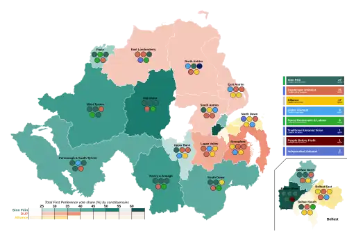 Sinn Féin became the largest party, marking the first time an Irish nationalist/republican party won the most seats in an assembly election in Northern Ireland, and has the right to nominate Northern Ireland's first nationalist First Minister. The DUP's vote share dropped almost 7% and it lost three seats; despite this, unionists won two more seats than nationalists—37 seats to 35—and a marginally higher share of the vote.[3] Alliance made large gains, as the only party to gain seats at the election, overtaking the UUP and the SDLP to become the third-largest party in the Assembly. The Greens lost both seats they held before the election and were unrepresented in the Assembly for the first time since 2003.[4][5]