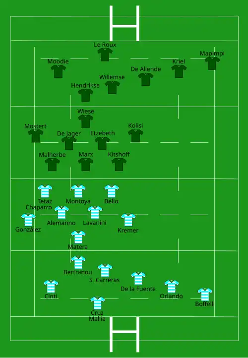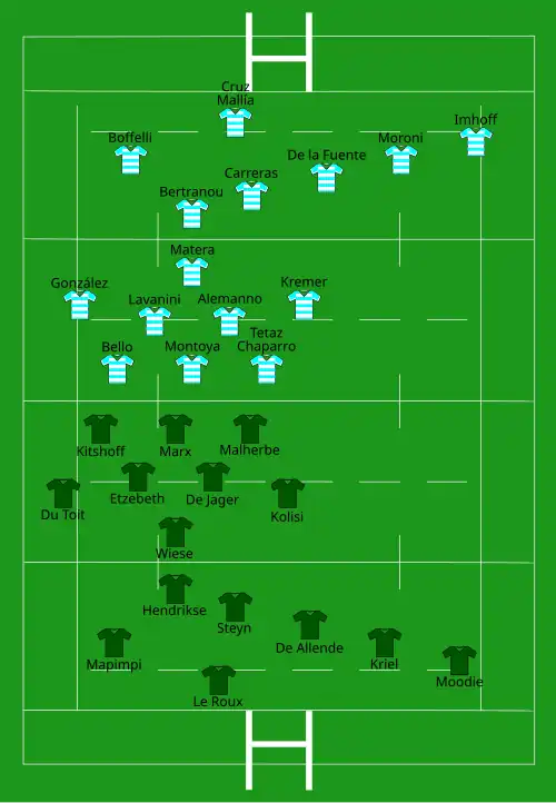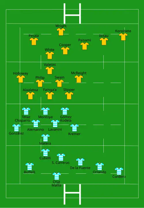 | Try: Imhoff 1' c Gallo (2) 5' c, 63' c De la Fuente 23' c González 30' m Boffelli 77' m Albornoz 80+1' c Con: Boffelli (5/7) 2', 6', 25', 64', 80+2' Pen: Boffelli (1/1) 53' | Report | Try: Slipper 11' c Ikitau 66' c Con: O'Connor (2/2) 12', 66' Pen: O'Connor (1/1) 16' |