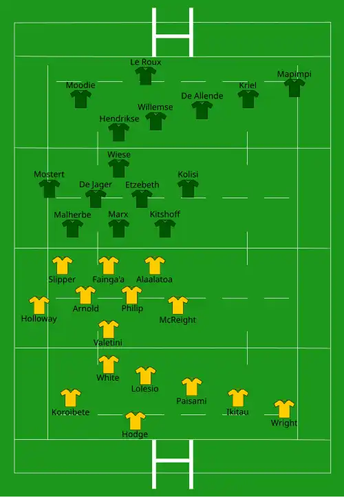 | Try: Samu 78' m Pen: Lolesio (1/1) 31' | Report | Try: de Allende 8' c Moodie 38' m Mostert 42' m Mapimpi 70' c Con: Willemse (1/3) 10' Steyn (1/1) 71' |