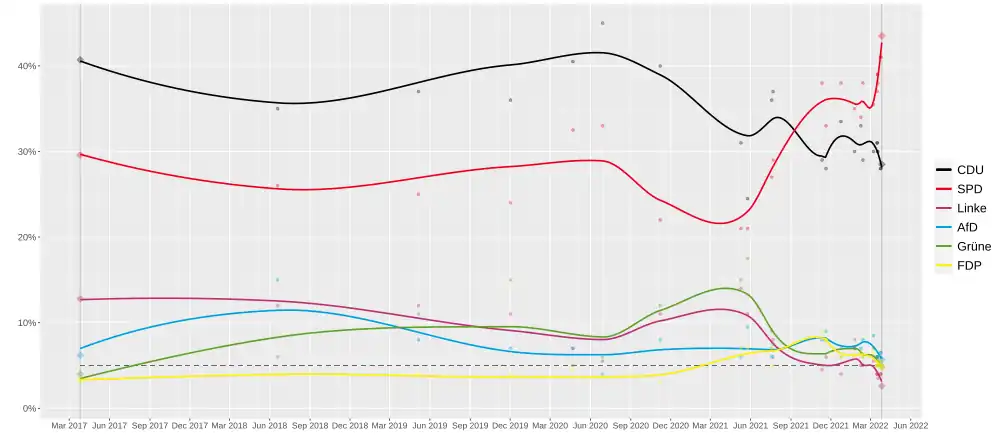 Until July 2021, the CDU had a solid lead in opinion polling. However, following the decline of the CDU on the federal level, the SPD surged ahead, cemented by the personal popularity of longtime Deputy Minister-President Anke Rehlinger.