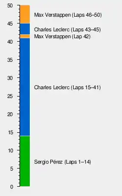 The race was started at 20:00 AST (UTC+03:00) on 27 March and lasted for 50 laps.[3] Yuki Tsunoda's car suffered a power unit issue on the way to the grid, preventing him from starting the race.[37] Pérez initially led from pole position ahead of Leclerc, Verstappen, and Sainz for 14 laps.[5] On lap 15, Nicholas Latifi retired after hitting the wall,[38] which brought out the safety car and occurred just after Pérez made a pitstop;[39] Leclerc and Verstappen were able to make their pit stops under safety car conditions, allowing them to rejoin in front of Pérez,[5] who illegally passed Sainz, who had also pitted and came out ahead of him, and had to give back position when race resumed.[5][40][41]