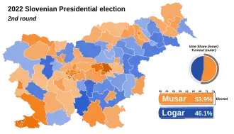 In the evening of 13 November 2022, the electoral commission reported that Pirc Musar won with nearly 54% of the vote, after which Logar conceded defeat and congratulated Pirc Musar on her victory.[36] Pirc Musar will become Slovenia's first female president, commander-in-chief of the Slovenian Army and also be responsible for appointing the head of the Central Bank of Slovenia.[37]