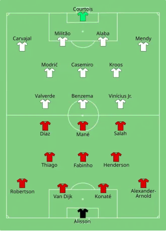 Liverpool then made their two more changes, as Alcântara and captain Jordan Henderson came off for Naby Keïta and Roberto Firmino in the 77th minute.[44][39] Liverpool continued to push for the equaliser, as passing took place between Salah and Firmino before Salah took another shot from just outside the penalty area which ended up being deflected off of Jota and carefully beaten away by Courtois down his bottom left.[37] Salah came forward again with eight minutes left, as a ball over the top from Fabinho found its way to the Egyptian who tried to battle off Ferland Mendy before coming across and having his resulting effort be saved by Courtois.[37] Madrid made their first change of the match in the 86th minute, as Valverde came off for Eduardo Camavinga.[44] At the end of regular time, the fourth official displayed that a minimum of five minutes of stoppage time would be played.[44][39] Madrid made their two other substitutions in stoppage time, as Dani Ceballos came on for Luka Modrić in the 90th minute and goalscorer Vinícius was brought off in the 93rd minute for Rodrygo.[44] Despite Liverpool's continued pushes for a goal in the final moments, the match was brought to an end with Madrid winning 1–0.[44]
