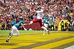 In their first ever game as the Washington Commanders, Carson Wentz threw for 313 yards and four touchdowns, including two to first-round rookie WR Jahan Dotson, who was named Pepsi NFL Rookie of the Week.[8] Washington opened a 14–3 half time lead thanks to TD's from Curtis Samuel and Dotson. The Jaguars then scored 19 unanswered points thanks to two TD's from James Robinson and a couple of field goals. This was aided by two interceptions thrown by Wentz on consecutive pass attempts, the second caught by 2022 first overall draft pick Travon Walker. Wentz responded by leading the Commanders on two TD drives to win the game 28–22.