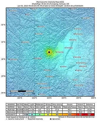 On June 1, 2022, a moment magnitude (Mw ) 5.8 or surface-wave magnitude (Ms ) 6.1 earthquake struck Lushan County in Ya'an, Sichuan Province, China.[1] At least four people were killed and 42 were injured.[3] The earthquake had a maximum intensity of VIII on the China seismic intensity scale, causing damage to many homes and triggering rockslides.